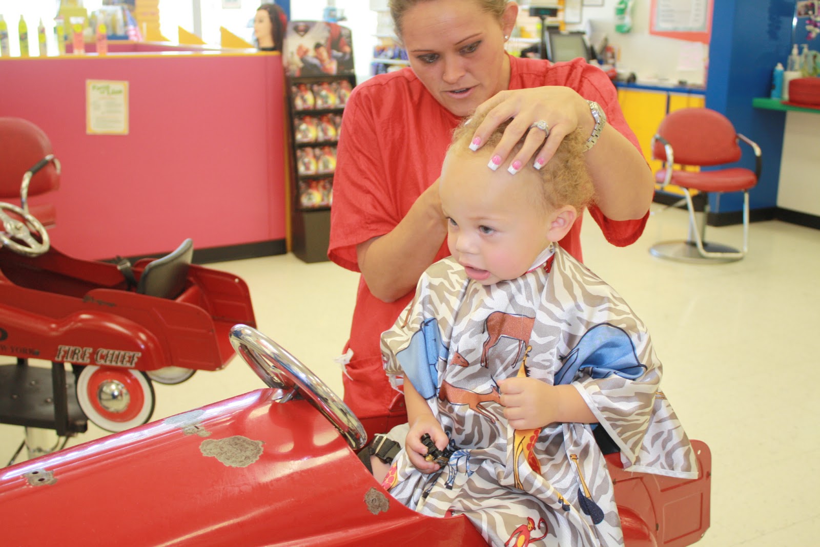 It's a kids-only salon with special chairs for the smaller kiddos. Noah was thrilled at first to get to sit in one of the old, tin firetrucks they had hoisted in front of a small TV playing our choice of Mickey Mouse or Dora (we went with Mickey). After a few moments he started looking very confused. He maybe fussed for a second but when the stylist showed Noah her "tickle wand" (aka clippers) and let him touch it and feel the tickling vibrations, he seemed to be ok with that.